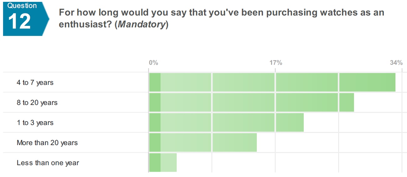 我發(fā)現(xiàn) aBlogtoWatch 非常有趣的一點是,它已經(jīng)發(fā)展成為成熟收藏家的平臺。只有25%的觀眾收藏不到三年,只有4%的人收藏不到一年。因此,98% 的人擁有超過 2 塊手表,59% 的人擁有 5 到 30 塊手表也就不足為奇了。據(jù)報道,有 2% 的人擁有 100 多塊手表。廣告訊息廣告信息結束