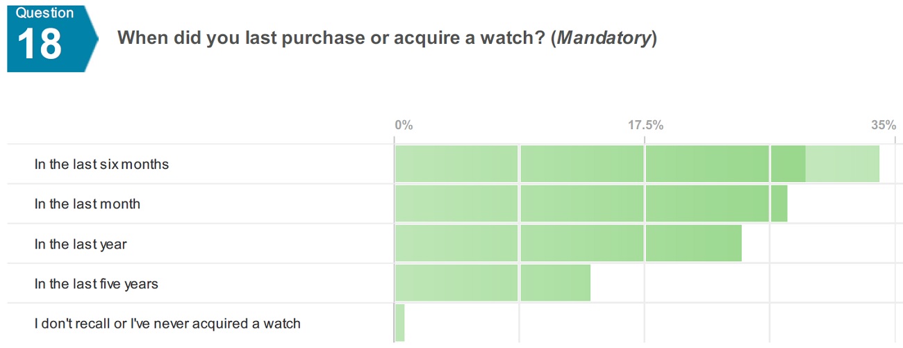 您還花費大量時間閱讀手表和查看評論。72% 的人每天觀看媒體,而 96% 的人至少每周向互聯(lián)網(wǎng)鐘表之神祈禱。幾乎沒有人在不做大量研究的情況下購買手表,而且考慮購買也需要時間。大多數(shù)手表愛好者需要 6-12 個月 (63%) 在您第一次對手表感興趣后做出購買手表的決定。46% 的人似乎更喜歡已經(jīng)存在了一段時間的手表品牌,44% 的人對歷史悠久的和新成立的手表品牌同樣感興趣。