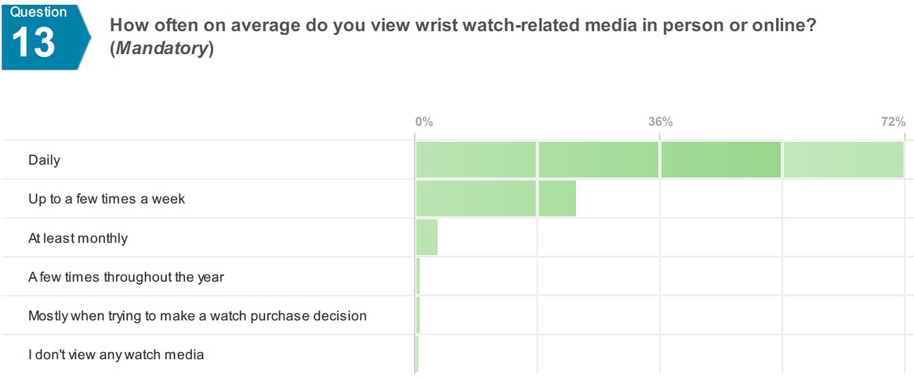 2019年10月和11月,aBlogtoWatch舉行了一次大型受眾調查,它旨在為許多問題提供答案。該調查的主要目的是收集有關手表愛好者消費者情緒的學術研究數(shù)據(jù)。2,000 名 aBlogtoWatch 受眾成員提供的數(shù)據(jù)為手表品牌營銷工作未能有效針對可能的客戶群體的理論提供了實證依據(jù)。明確的數(shù)據(jù)表明,高達 80% 的手表愛好者沒有被手表品牌的廣告信息有效地接觸到。隨后,歷史上可能與非常重要的手表愛好者群體保持密切關系的品牌錯過了與他們最重要的客戶群體的關系。雖然本文的目的不是討論該研究項目的全部發(fā)現(xiàn),但事實上,