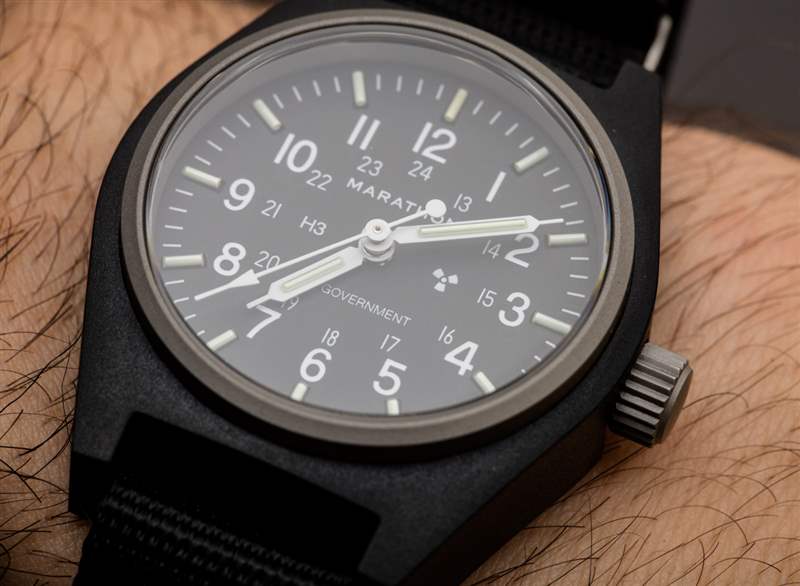 Marathon GPM 內部是日本精工儀器自動機芯 NH35。這種簡單的 3Hz、41 小時動力儲存機芯經久耐用且相對可靠,是士兵手表中的一匹不錯的主力。Marathon 將機芯稱為“雙上鏈”,這意味著它可以自動上鏈或通過表冠上鏈。盡管機芯是日本的,但每只 Marathon GPM 手表都是在 Marathon 的全資生產工廠的 La Chaux-de-Fonds 組裝的。所以在很多方面,這是一塊瑞士制造的手表,實際上并沒有說“瑞士制造”。