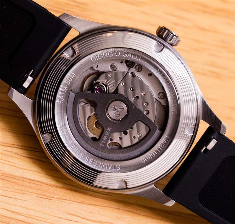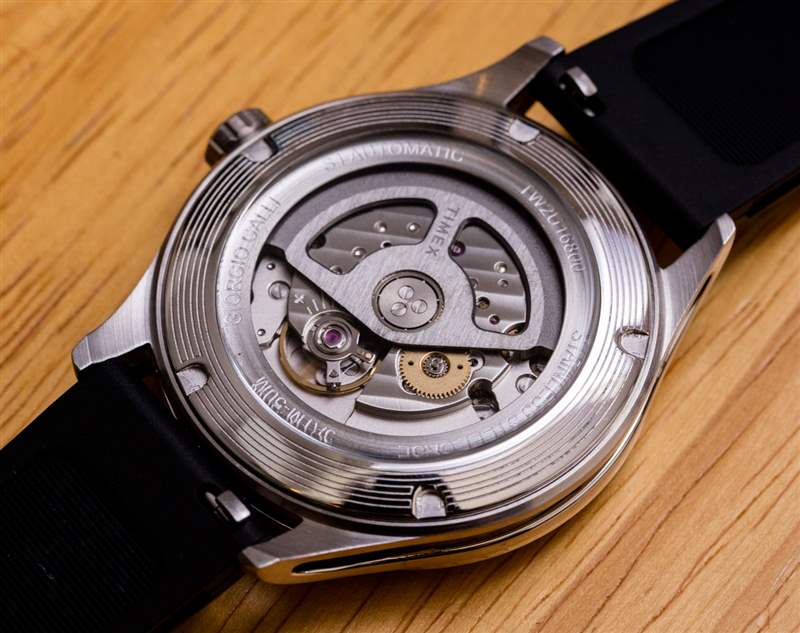 說到機械機芯,Giorgio Galli S1 Automatic 內部是什么?當然是自動的。天美時這里使用的是更高端的日本 Miyota (Citizen Group) 機芯 9039,這里只有時間,沒有日期窗口(提供更理想的表盤對稱性)。這是 Miyota 9000 系列機芯,這意味著它以 4Hz 的頻率運行,具有 42 小時的動力儲存,并且從表殼后部觀察時具有非常漂亮的裝飾美感。
