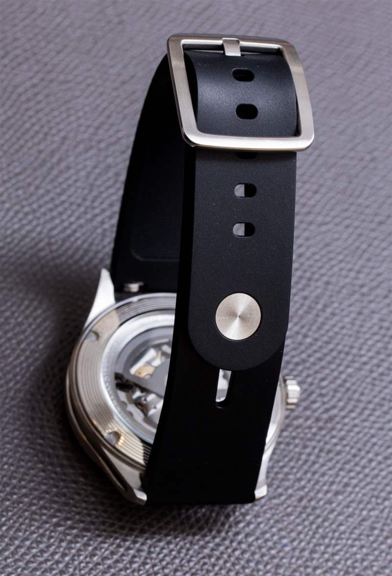 表帶本身很漂亮,感覺更像是你在時尚智能手表上找到的東西,而不是價格低于 500 美元的機械表。黑色表帶由優質合成橡膠制成。我敢打賭,這款手表在其他顏色的類似表帶上看起來會同樣漂亮。請注意表帶側面有一個有趣的凹槽——因為它與鏤空表殼側面的凹槽是一條連續和諧的線條。說到鏤空表殼——這是我見過的唯一一款帶有小刷子的手表(就像那些用來清理電動理發器的那樣)——我相信這是為了幫助這只手表的佩戴者清除可能收集在手表的結構凹槽中。