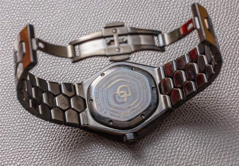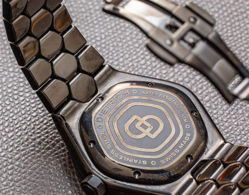 加上表冠,TC 鋼制表殼寬 46.2 毫米,沒有表冠,表殼寬 43.8 毫米,厚度僅為 9.3 毫米。考慮到與表殼的喇叭形側面相比,表耳變得狹窄,它實際上磨損了一點。在這里,我們看到迪特里希再次嘗試使用六邊形主題。這款腕表采用定制的藍寶石水晶表鏡和全鋼表殼和表鏈,重約 166 克,具??有 50 米防水深度和旋入式表冠。
