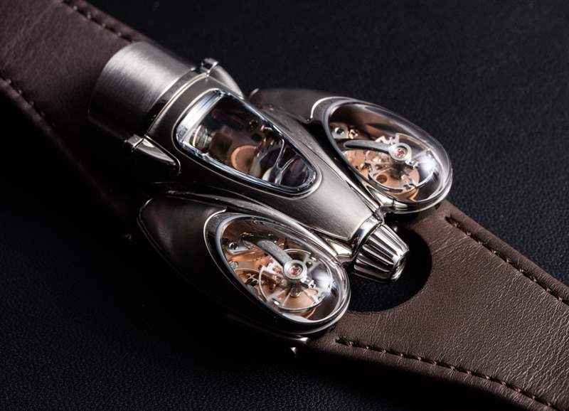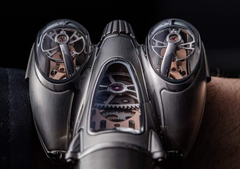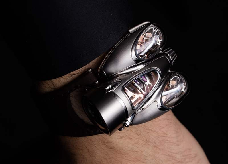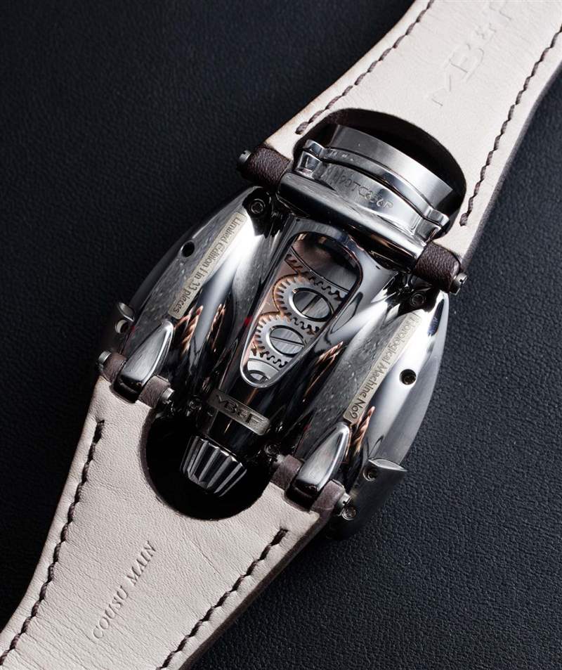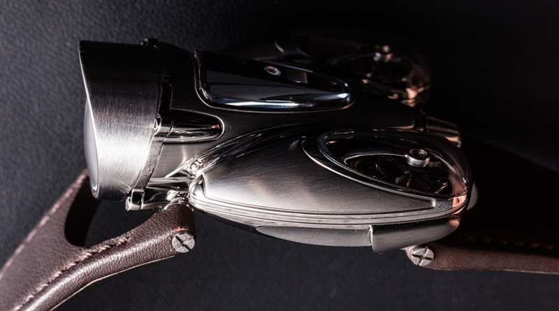 HM9 Flow 機(jī)箱的俯沖設(shè)計(jì)顯然受到了一代飛機(jī)和汽車的啟發(fā),這些飛機(jī)和汽車的形狀在風(fēng)洞中得到了完善,以增強(qiáng)空氣動(dòng)力學(xué)性能。手表確實(shí)不需要空氣動(dòng)力學(xué)特性,但如果你擁有一輛具有這種外觀的老式汽車,至少你可以擁有一款非常兼容的時(shí)計(jì)。我碰巧認(rèn)為表殼曲線既漂亮又有趣,甚至優(yōu)雅,盡管 MB&F 沒(méi)有讓產(chǎn)品看起來(lái)很女性化。