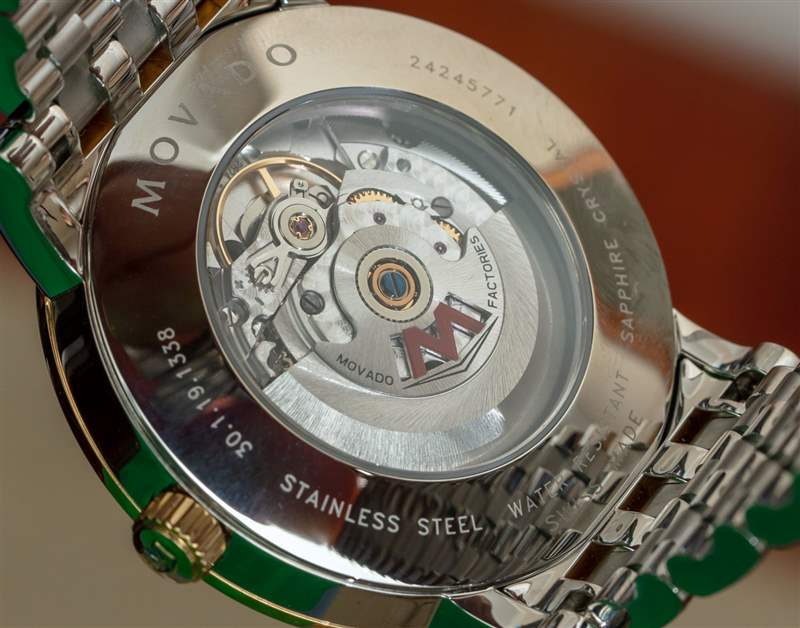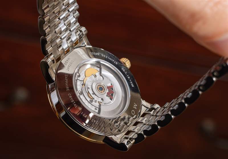 摩凡陀采用更高級的精工級機(jī)芯,裝飾精美,并配有定制的摩凡陀“red M”自動擺陀。機(jī)芯以 4Hz 頻率運(yùn)行,動力儲存約兩天。使用自動機(jī)芯真的是為了吸引像我這樣的手表愛好者。鑒于表盤只有時針和分針,您甚至看不到運(yùn)行秒針。因此,佩戴者非常重視自動機(jī)芯的價值——但對于鐘表愛好者級產(chǎn)品而言,這絕不是罕見的。