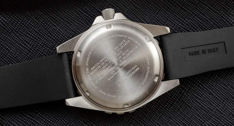 盡管 Marathon 是一家加拿大公司,但該品牌的手表是在瑞士拉紹德封組裝的,并配備了瑞士制造的機(jī)芯。Jumbo Diver’s Automatic 內(nèi)部是瑞士 ETA 2836-2 自動星期/日期機(jī)芯,以 4Hz 運行,動力儲存約兩天。Marathon 在舒適的 22 毫米寬黑色橡膠表帶和三鏈節(jié)鋼表鏈上提供 JDD。后者不會像運動型或?qū)嵱眯停_實有助于讓手表看起來更考究。盡管我通常是一個手鐲人,但我更喜歡帶子上的 JDD。
