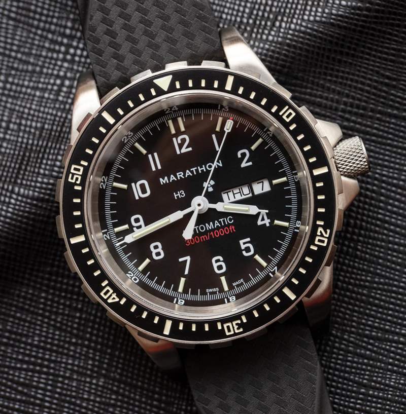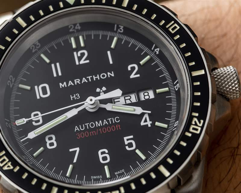 深表盤很簡單,但具有軍用手表所需的所有標(biāo)記;易讀性很好。自發(fā)光氚氣管用于指針和時標(biāo),以實現(xiàn)完美的夜視,我喜歡將 24 小時時標(biāo)放置在表盤周圍的法蘭環(huán)上,而不是占用寶貴的主表盤空間。鑒于表盤尺寸較大,星期/日期窗口并不會真正占用太多空間,即使它們確實會蠶食 3 點鐘的小時標(biāo)記。我在這里要做的唯一改進(jìn)是讓 Marathon 使用匹配的黑色日歷盤(而不是白色日歷盤),在表盤上具有高度對比度。