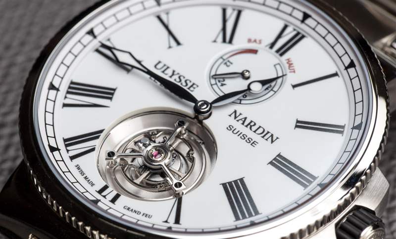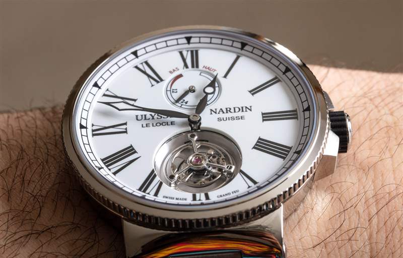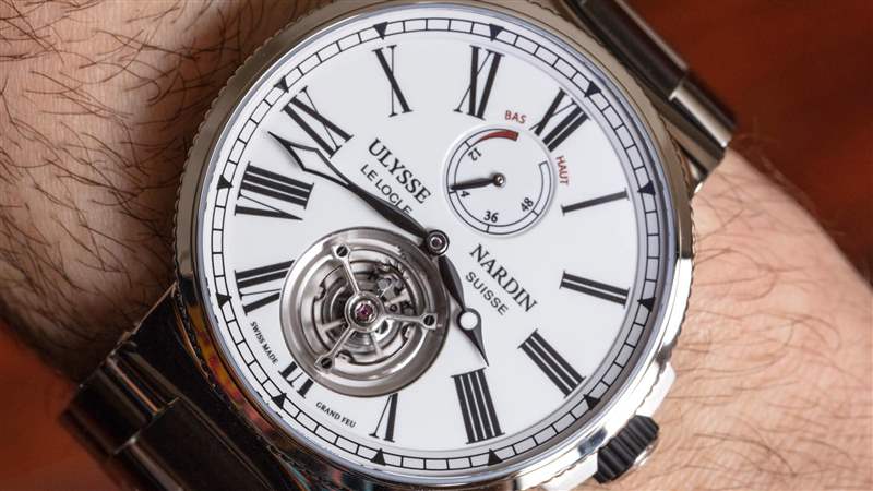 低價(jià)陀飛輪是否意味著犧牲性能?不,實(shí)際上。事實(shí)上,泰格豪雅(TAG Heuer)和雅典(Ulysse Nardin)的陀飛輪機(jī)芯是我比大多數(shù)陀飛輪機(jī)芯更值得信賴的機(jī)芯,事實(shí)上,其中一些價(jià)格較低的瑞士陀飛輪具有出色的性能。我或多或少肯定,您可以從 Ulysse Nardin 內(nèi)部制造的 UN-128 自動(dòng)陀飛輪機(jī)芯中獲得天文臺(tái)級(jí)的性能,該機(jī)芯位于 Marine Tourbillon 內(nèi)部。該機(jī)芯采用可靠的硅平衡擺輪,擁有超過(guò)兩天的動(dòng)力儲(chǔ)存,工作頻率為 4Hz。至少,在這個(gè)機(jī)芯中配備陀飛輪并不要求用戶為了佩戴它而犧牲任何功能或性能。出于這個(gè)原因,也因?yàn)槲蚁嘈胚@是一個(gè)相對(duì)準(zhǔn)確的動(dòng)作,