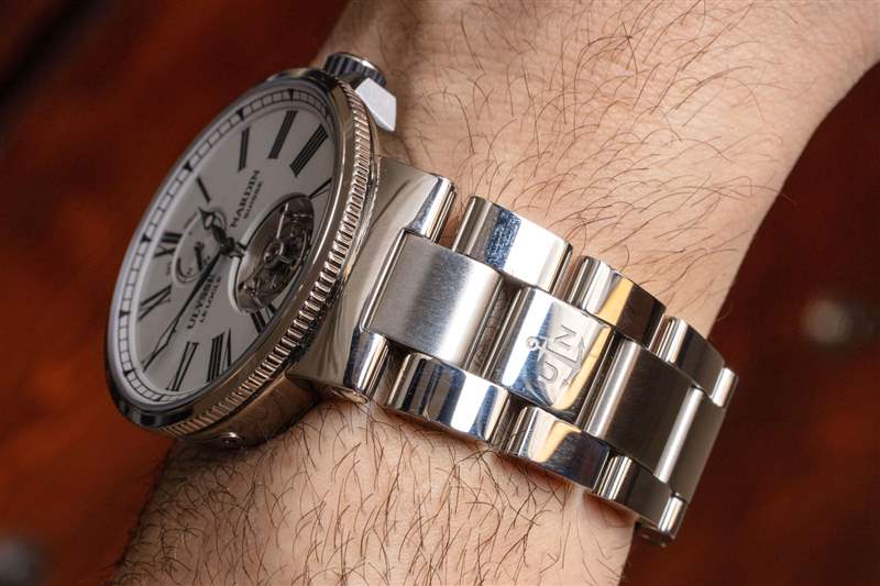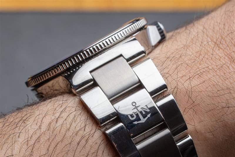 我更喜歡手鐲——主要是因?yàn)橛腥颂峁HB桿精鋼表鏈設(shè)計(jì)簡(jiǎn)單,結(jié)構(gòu)上乘。它與表殼的形狀很好地融合在一起,并提供了非常舒適的佩戴體驗(yàn)(盡管表帶選項(xiàng)也不錯(cuò))