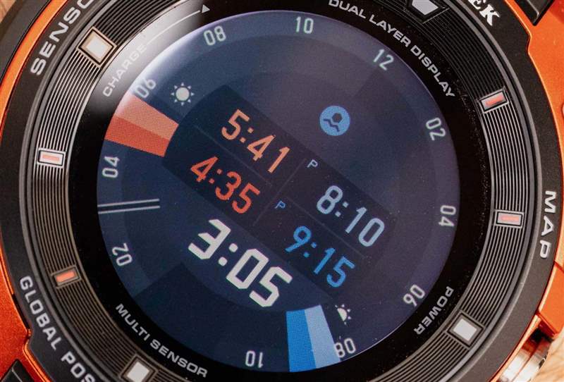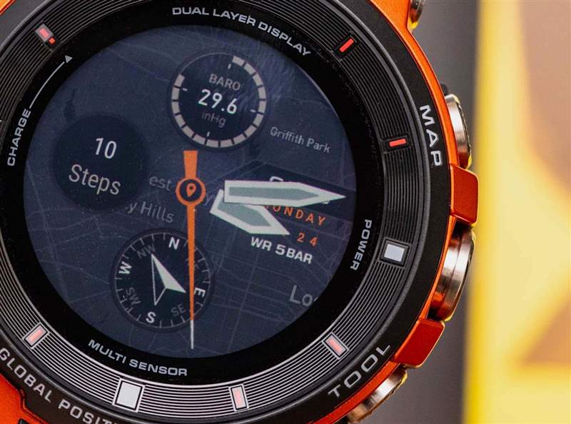 事實(shí)上,卡西歐在設(shè)計(jì) WSD-F30 時(shí)似乎認(rèn)為它的佩戴者會經(jīng)常離開傳統(tǒng)的手機(jī)接收區(qū)。(能夠在本地存儲地圖數(shù)據(jù)就是一個(gè)例子。)這款手表還包括許多省電功能,如有必要,可幫助將智能手表的電池壽命從一到兩天延長到一個(gè)月左右。在 WSD-F30 中實(shí)現(xiàn)這一點(diǎn)的方式很有趣,因?yàn)閷τ谶@款產(chǎn)品,卡西歐引入了其雙屏技術(shù)。這對卡西歐本身來說并不新鮮,但對于該品牌的智能手表來說卻是新鮮事。這個(gè)想法是有一個(gè)底部、背光、全彩色 OLED 屏幕,頂部是一個(gè)透明的單色屏幕。