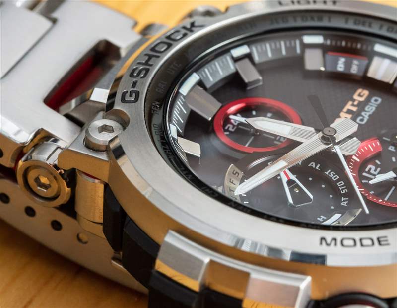即使指針和時標涂有夜光,手表的表盤上也有一個明亮的 LED 燈,可以輕松照亮表盤,以便在各種黑暗環境中查看。該機芯的其他功能包括計時碼表、倒數計時器、世界時間指示器和鬧鐘。表盤上的模式選擇器可幫助您循環使用這些功能,并且表盤上的指針通常會根據當前的功能模式重新調整用途。當您將 MT-G 表盤切換到計時碼表模式時,簡單地觀察表盤上的所有指針移動會很有趣。