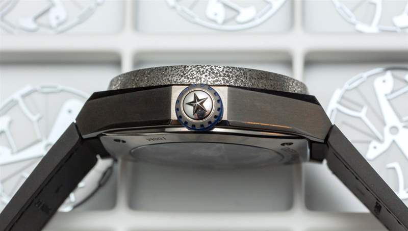 Zenith Defy Inventor 的鈦金屬表殼寬 44 毫米,厚 14.5 毫米(防水深度達 100 米),在佩戴和外觀方面與其他 Defy 系列模型相似,除了機芯和表盤完全不同設計(但真力時自己模仿了其系列中其他一些沒有異國情調的 9100 機芯的較便宜的型號)。折疊式展開表帶為橡膠材質,外側帶有藍色鱷魚皮內襯——完美融合了佩戴舒適性和時尚風格。這是您看到真力時從姊妹品牌宇舶表大量借用的地方,如果您正在尋求現代(和舒適)的手表佩戴體驗,這是一件好事。