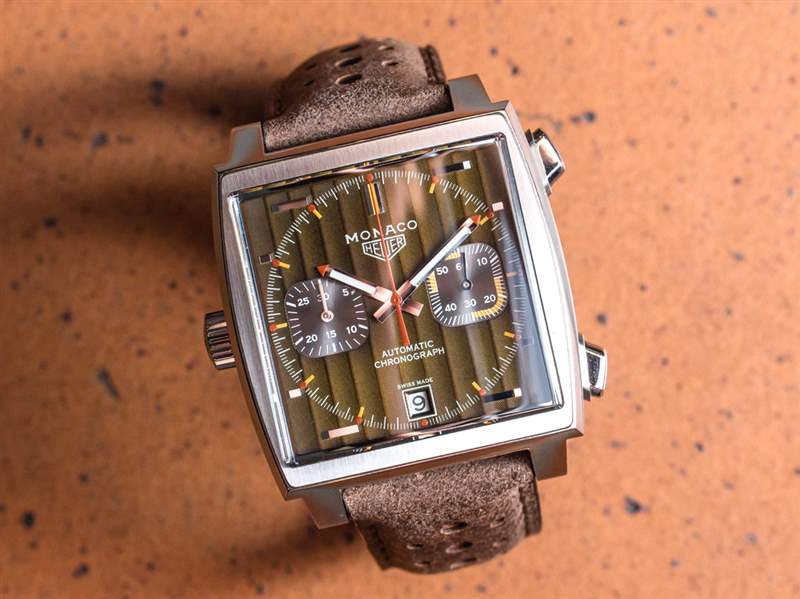 時標的方向、指針和小表盤的設(shè)計,以及這款限量版 Monaco 1969-1979 手表的整體外觀與“原始風(fēng)格”相同,但采用了新的調(diào)色板,肯定會偏光和有意利基市場。豪雅稱表盤顏色為“帶有日內(nèi)瓦波紋的綠色”。它是一種金屬橄欖綠色,帶有垂直拋光條紋,類似于您在許多瑞士制造的手表機芯表面上發(fā)現(xiàn)的條紋。大地色系讓人想起 1970 年代風(fēng)格設(shè)計中流行的調(diào)色板,并以各種形式卷土重來。我真的很喜歡泰格豪雅如何理解這種特殊的摩納哥配色在設(shè)計上是小眾的,并將其作為泰格豪雅限量版編號方案中的一組獨家產(chǎn)品。