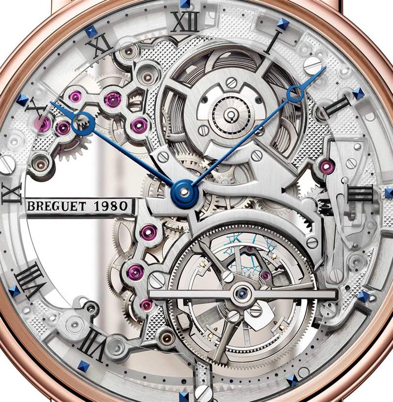 寶璣Classique Tourbillon Extra-Plat Squelette 5395 如此可穿戴的原因在于其重量輕且厚度為7.7 毫米的相當(dāng)薄的表殼。表殼寬 41 毫米,防水深度達(dá) 30 米,夾在藍(lán)寶石水晶中。表殼有“直立的凸耳”,可以延伸到小手腕的邊緣。請注意,這本身并不是一個新的表殼和機(jī)芯,而是Classique Tourbillon Extra-Plat 第一次被呈現(xiàn)為骨架。