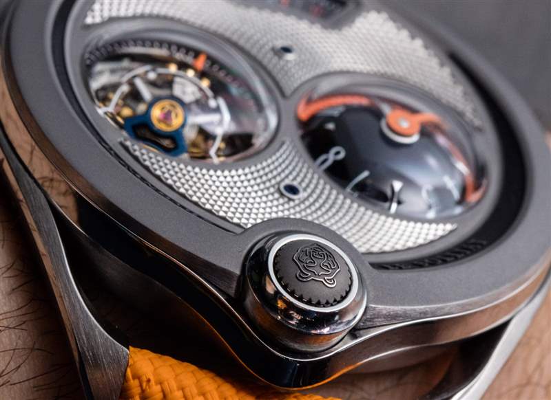 從視覺(jué)上看,DC 6 Solstice Half Hunter 看起來(lái)就像一張盯著你看的科幻臉?;蛘叻蓝久婢?,或者蒼蠅,或者蚊子,取決于你的觀點(diǎn)。兩個(gè)相對(duì)的表盤(pán)看起來(lái)像眼睛,上面覆蓋著高度圓頂?shù)乃{(lán)寶石水晶。臉的“嘴”實(shí)際上是表冠,這是 DC 系列手表的獨(dú)特元素之一,被 Candaux 稱(chēng)為“神奇的王冠”。DC 1 和 DC 6 系列手表沒(méi)有像我們?cè)诖蠖鄶?shù)其他手表中發(fā)現(xiàn)的那樣在表殼側(cè)面有一個(gè)固定的表冠,而是有一個(gè)表冠,當(dāng)你按下它時(shí)它就會(huì)松開(kāi)。將表冠從其“內(nèi)部位置”松開(kāi)后,即可正常拉出以設(shè)置時(shí)間。我所熟悉的唯一一款具有類(lèi)似表冠概念的時(shí)計(jì)是香奈兒 J12 逆行神秘陀飛輪.?DC 6 表冠系統(tǒng)本身由 31 個(gè)零件組成,并使用由三個(gè)墊圈組成的復(fù)雜系列來(lái)保持腕表的防水性能。