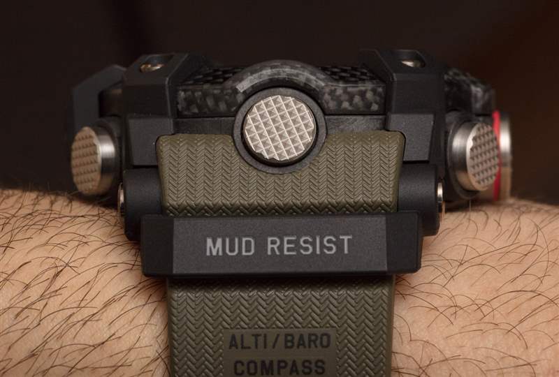 Mudmaster GG-B100-1A3 表圈具有碳纖維外觀,但碳纖維與樹脂混合而成。然而,卡西歐在其一些更昂貴的 G-Shock 型號中確實使用了完全碳纖維部件——在不久的將來,全碳纖維部件很可能會在這個價位上進入模型。推桿的新設計使卡西歐能夠消除一些視覺體積,同時承諾令人難以置信的防泥、防塵和防塵水平(更不用說防水性了)。推桿也是全金屬的,上面有非常酷的防滑紋理圖案。您可以在前置式按鈕(恰好激活背光)上欣賞這種令人愉悅的表面紋理。