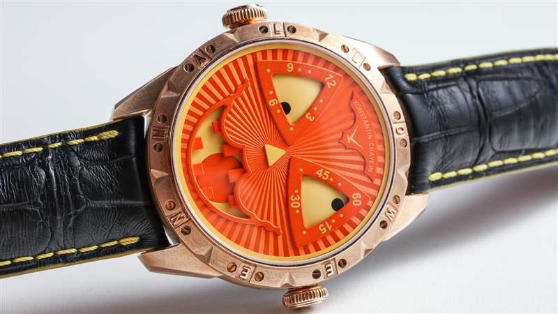 對于這個版本的小丑,Konstantin Chaykin 決定用青銅制作萬圣節——這應該會很有趣。表殼寬 42 毫米,厚 13.7 毫米。表盤上方是 AR 涂層藍寶石水晶。“萬圣節”也拼寫在整個表圈周圍。