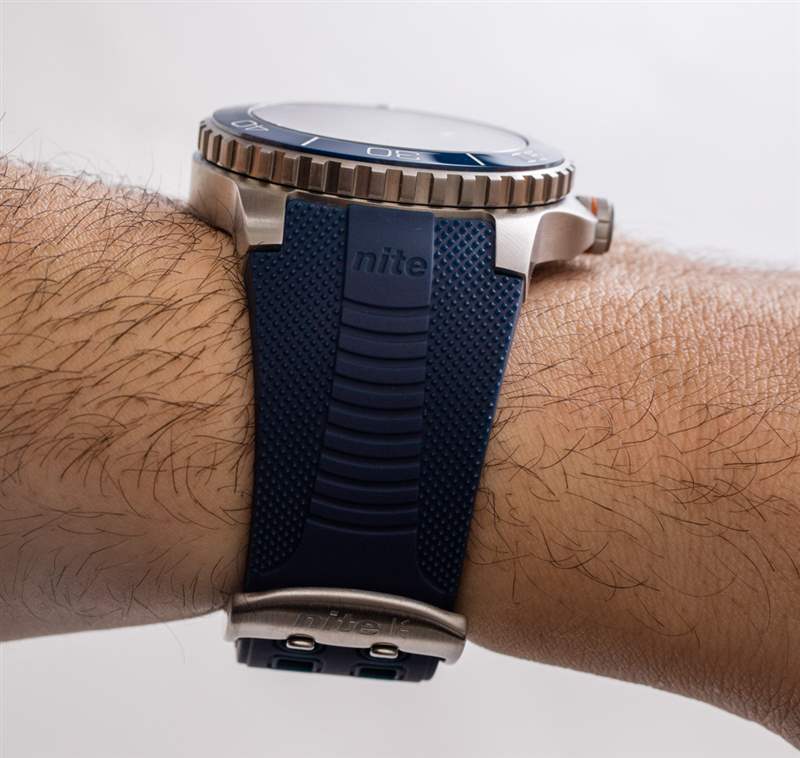 暫時回到隨附的表帶,我想提一下 Nite 使用了更“安全”的兩爪式搭扣以及兩個小標簽,有助于將多余的表帶固定在表帶環中。如果沒有這個功能,光滑紋理的聚合物表帶可能會掉出環——而橡膠表帶增加的表面摩擦力并沒有這個問題。我很欣賞 Nite 確保根據使用的材料正確設計表帶。