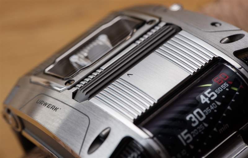 在典型的 Urwerk 時尚中,表殼的貼合度和表面處理非常出色。除了看起來不錯外,外殼部件還具有出色的公差,并且都非常適合。考慮到一切都需要定制,以及 UR-111C 表殼和機芯使用的各種形狀、飾面和材料,這令人印象深刻。然而,后凸耳結構并沒有清晰表達——盡管它看起來好像是有意的。以這個價格和這種設計,我希望看到一些凸耳鉸接動作。