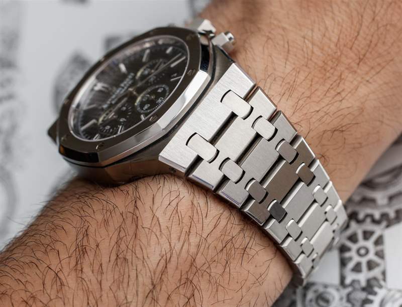 Audemars Piguet 皇家橡樹計時碼表寬 41 毫米,是一款由大量優質不銹鋼制成的大型時計?;叵胍幌?,皇家橡樹的“巨型”版本(通常被稱為)只有 39 毫米寬。表殼的表耳到表耳的距離較長,為53mm,并且由于表耳結構的間距較大,佩戴尺寸在視覺上有所增加。防水性只有 50m,對于日常佩戴來說綽綽有余,但如果愛彼想進一步推動皇家橡樹的“運動”方面,我認為 100m 是一個更具競爭力的數字。