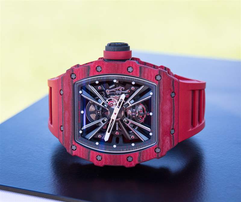 RM 12-01 Tourbillon 的新功能在于手動上鏈陀飛輪機芯的設計。受實際橋梁結構和汽車發動機的啟發,四個梁式橋梁有助于將機芯固定在表殼上,提供 Richard Mille 聲稱的在高達 5,000 G 力的環境中的穩定性。手動上鏈機芯僅提供陀飛輪時間,以 3Hz 運行,動力儲存 70 小時。它與其他僅限時間的陀飛輪 Richard Mille 手表看起來并沒有根本不同,但它確實提供了新的藝術機芯架構,并為這個熱門品牌提供了另一種風格的模型。