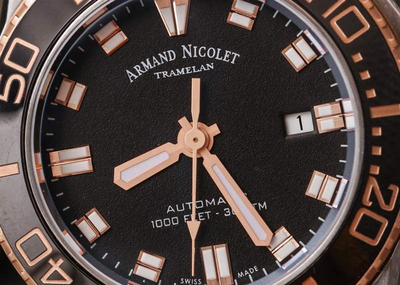 表盤周圍是我上面提到的傾斜旋轉(zhuǎn)潛水表圈。表圈嵌件材料采用拋光黑色陶瓷,表圈上的機切數(shù)字根據(jù)JS9的版本涂有不同的顏色。除了這種玫瑰金色油漆外,其他版本還使用了白色/銀色。JS9 的表盤顏色目前為白色、黑色和藍(lán)色。Armand Nicolet 似乎真的很喜歡玫瑰金外觀,因為 2018 年可用的 JS9 型號中有一半以上采用這種顏色。一些最有趣的與審查版本相似,但帶有白色表盤。“經(jīng)典” JS9 潛水表型號可能是帶有銀色/白色文字/標(biāo)記和藍(lán)色或黑色表盤的型號。
