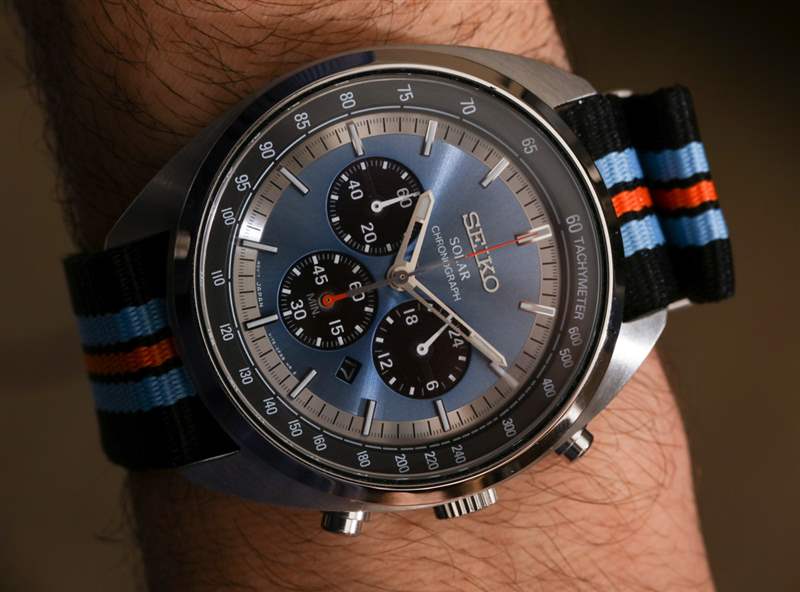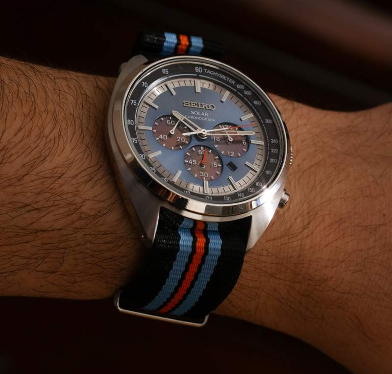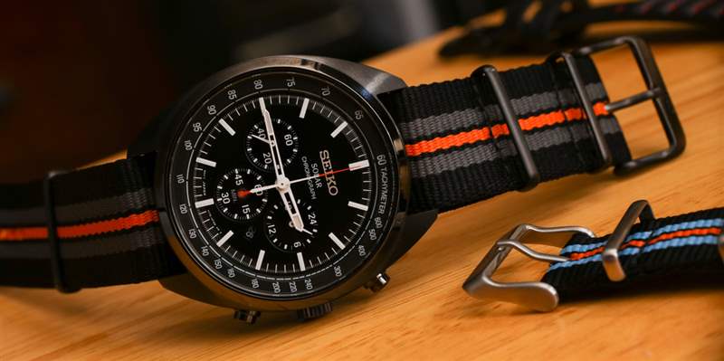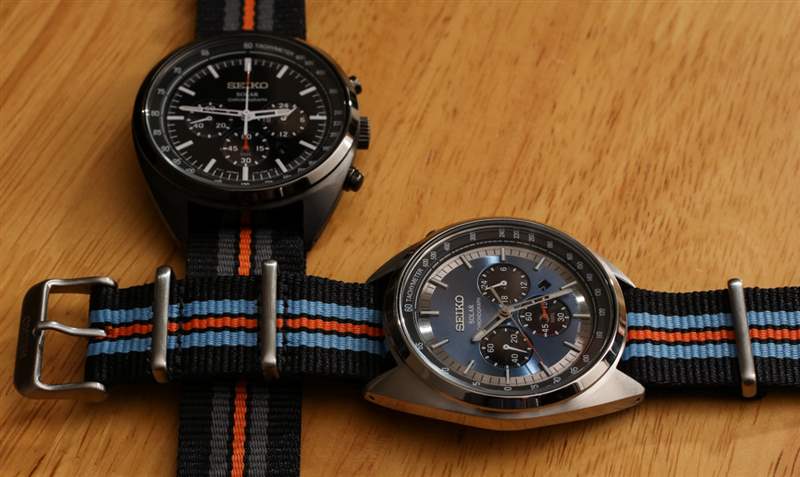 精工將手表與幾乎沒(méi)有眩光的扁平 AR 涂層礦物水晶配對(duì)。這對(duì)我來(lái)說(shuō)是錦上添花,也是表盤(pán)看起來(lái)如此出色的原因。傾斜的拋光表圈通向拉絲和拋光(側(cè)面)酒桶形鋼制表殼,SSC669 提供黑色,SSC667 提供天然鋼。表殼簡(jiǎn)單但制作精良,配有對(duì)比拋光和視覺(jué)美感,使其感覺(jué)比實(shí)際更薄(約 12.5 毫米厚)。表殼寬 43.5 毫米(防水深度達(dá) 100 米),非常舒適,搭配這些彩色尼龍 NATO 風(fēng)格的肩帶。這實(shí)際上是我記得的第一款帶有北約風(fēng)格表帶的精工手表。雖然 SSC667 和 SSC669 是 2018 年的新型號(hào),它們是以前可用的 Seiko Recraft SSC569 的修訂版——我覺(jué)得它沒(méi)有那么吸引人。這是一塊不錯(cuò)的手表,但感覺(jué)就像精工試圖將復(fù)古賽車(chē)計(jì)時(shí)碼表與正裝手表結(jié)合起來(lái),我發(fā)現(xiàn)結(jié)果有點(diǎn)尷尬。這些 SSC667 和 SSC669 型號(hào)具有不同的表盤(pán)和表帶,讓世界變得與眾不同。廣告訊息廣告信息結(jié)束