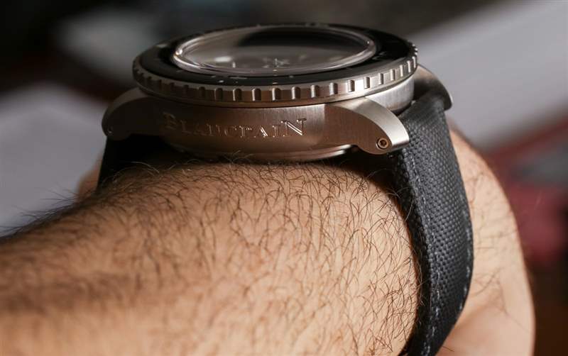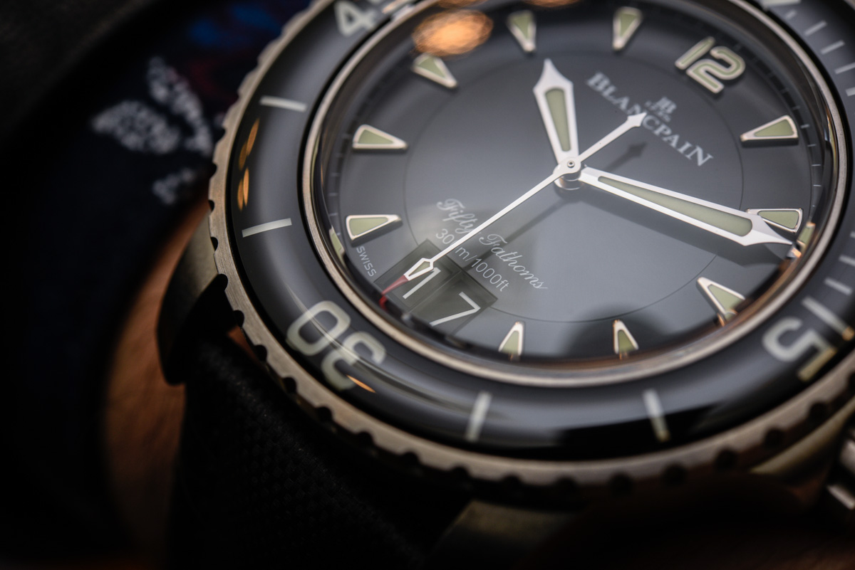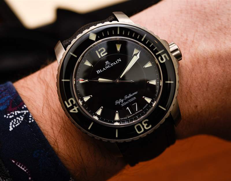 確實,不再生產的寶珀 500 噚潛水表是該品牌現代潛水表型號中第一款使用鈦金屬的。該型號更大,寬 48 毫米(厚約 17 毫米),相比之下,已經很大的 45 毫米寬(和 16.27 毫米厚)五十噚在尺寸上顯得適中。與五十噚精鋼的精致拋光處理不同,這款鈦金屬 5050 型號對鈦金屬進行了更具工具風格的緞面拉絲處理。與寶珀久負盛名的運動手表的表殼一樣,該表殼以精美的精度制作而成,五十噚自動大日歷腕表所有組件的整體質量都非常出色。