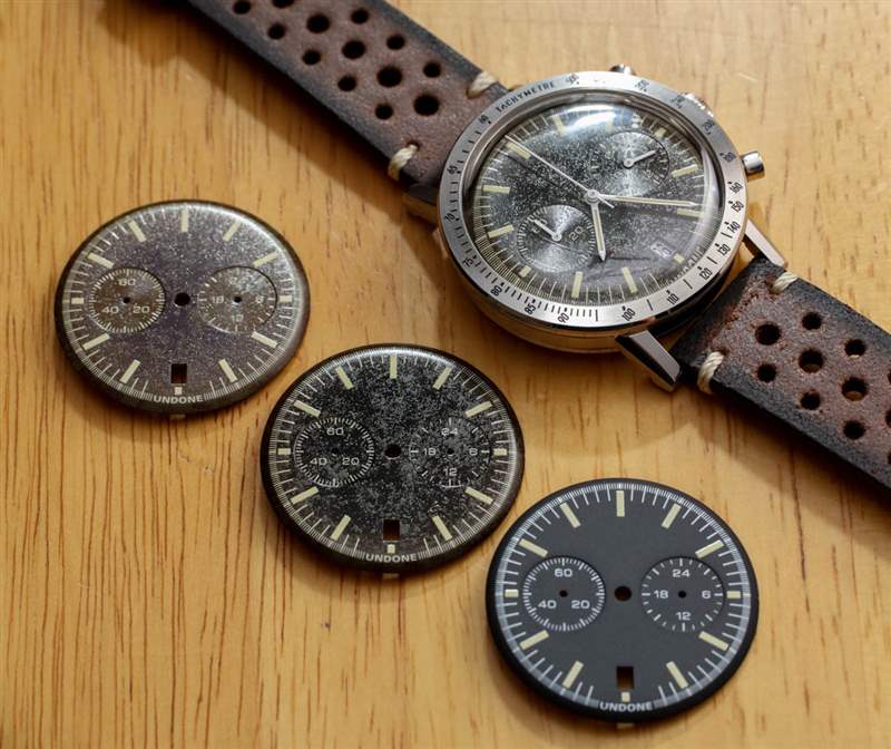 沒有標準的紋理或顏色可以讓表盤看起來變色。UNDONE 不僅需要與他們的表盤供應商合作創造一種新技術來產生這種美感,而且還需要確保它們看起來像真正的熱帶表盤。UNDONE 特別選擇了更分散的變色,而不是像在一些實際的復古熱帶表盤手表中所看到的那樣完美光滑的變色,從黑色到柔和的巧克力棕色。UNDONE實際上開發了三個熱帶表盤,每個表盤代表不同的老化“程度”。
