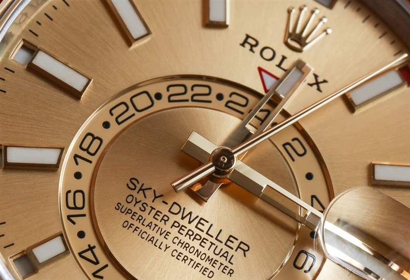 勞力士喜歡吹噓 9001 型機芯擁有多少專利(其中七項)。這確實是一個非常復雜的運動。作為一家公司,勞力士實際上喜歡專注于更簡單的機芯,因為它們往往使用壽命更長且需要的服務更少。毫無疑問,9001 型機芯堅固耐用,其復雜性實際上被它的易用性所籠罩。讓我們從表盤上的信息開始。與其他勞力士手表相比,Sky-Dweller 最獨特的部分是表盤上的外露偏心環,用于顯示 GMT 時間。通過紅白箭頭指針在 12 點鐘下方讀取第二時區。這種展示在推出時既新穎又非勞力士,并立即引發了爭論。實際上,原始 Sky-Dweller 手表的整個表盤也是如此,這些手表具有各種顏色的阿拉伯或羅馬數字時標。雖然很多人在它剛問世時就欣賞 Sky-Dweller 的新穎性,但很少有人稱它特別漂亮。廣告訊息廣告信息結束