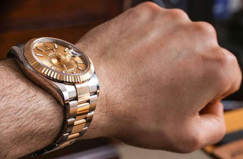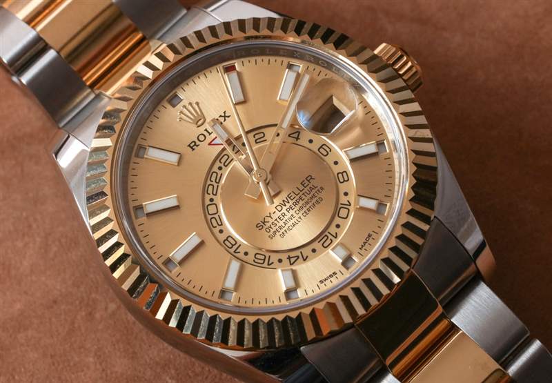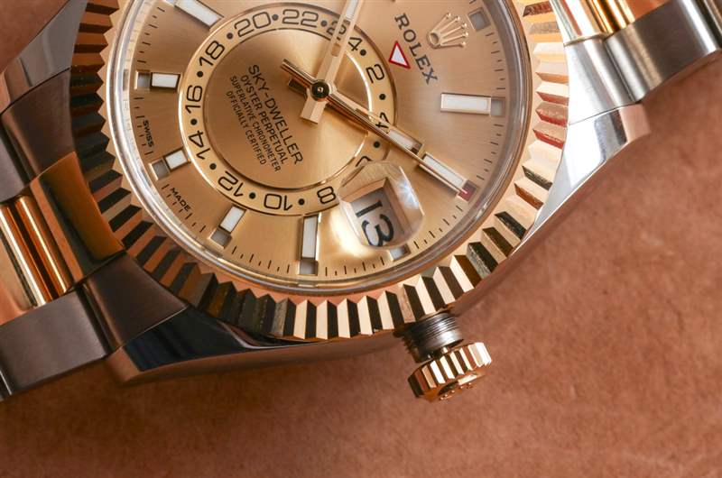 Sky-Dweller 與大多數其他勞力士手表的區別還在于尺寸。盡管表殼設計仍然是我們所熟知和喜愛的勞力士蠔式,但勞力士將其制作成 42 毫米寬的表殼,使其成為該品牌生產的最大的“考究”時計。在發布時也可以預見的是,Sky-Dweller 會非常昂貴。勞力士傾向于在全金表殼中推出新型號和機芯,后來才推出雙色或全鋼表款。因此,勞力士直到 2017 年才推出 Rolesor(鋼和金)版本的 Sky-Dweller。沒有全鋼型號,因為勞力士標志性的凹槽表圈是用金制成的。然而,最“易于使用”的 Sky-Dweller 版本配備全鋼表鏈和表殼,表圈僅采用 18k 白金制成。客觀地說,搭配手鐲的 18k 永恒玫瑰金 Sky-Dweller 目前售價 48,850 美元,而主要為鋼制型號的入門級價格為 14,400 美元。評測參考 326933 的價格為 17,150 美元,因為表鏈和表冠中添加了黃金材料。