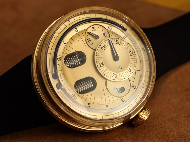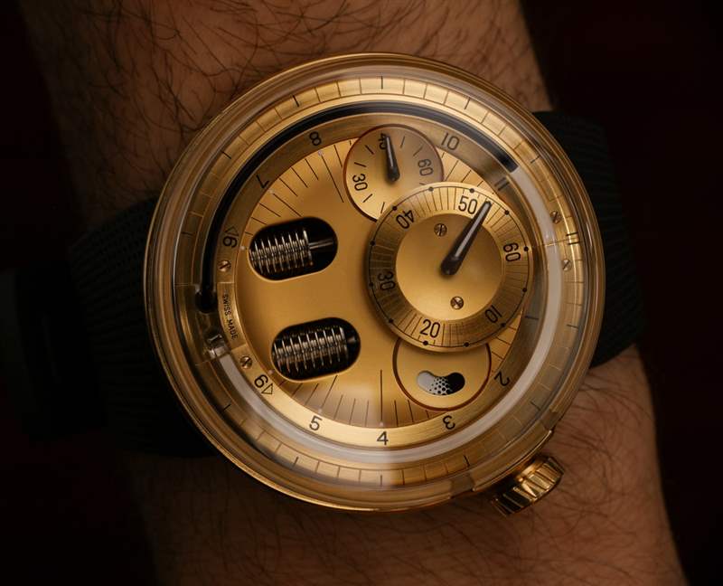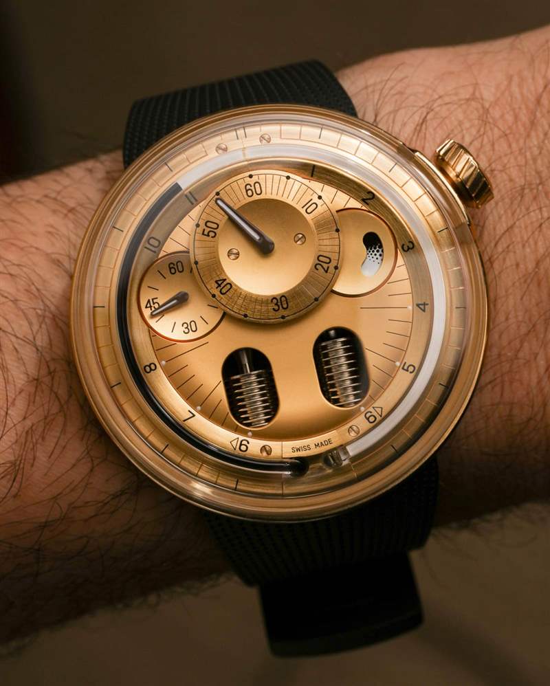 對于剛接觸 H0 表盤的人來說,了解如何讀取時間可能是一項挑戰(zhàn)。當(dāng)我試圖知道如何將信息片段放在表盤上時,我會看到人們的臉上形成混亂的線條,從而獲得了輕微的虐待狂快感。它實際上只是調(diào)節(jié)器式顯示器的一種變體,它具有單獨的小時、分鐘和秒表盤。一個人只需要提前知道這一點。也許人們可以從這樣的時計中獲得的最大樂趣就是能夠完全忽略分鐘和秒。Botta 和 Meistersinger 等品牌幫助普及了僅顯示小時的“單手”表盤。顯然,H0 不是這樣的手表,但人們可以完全專注于管幾個小時,以至少或多或少地知道使用 12 小時格式的時間。即使這樣,