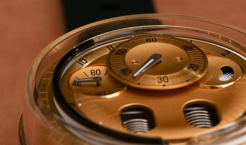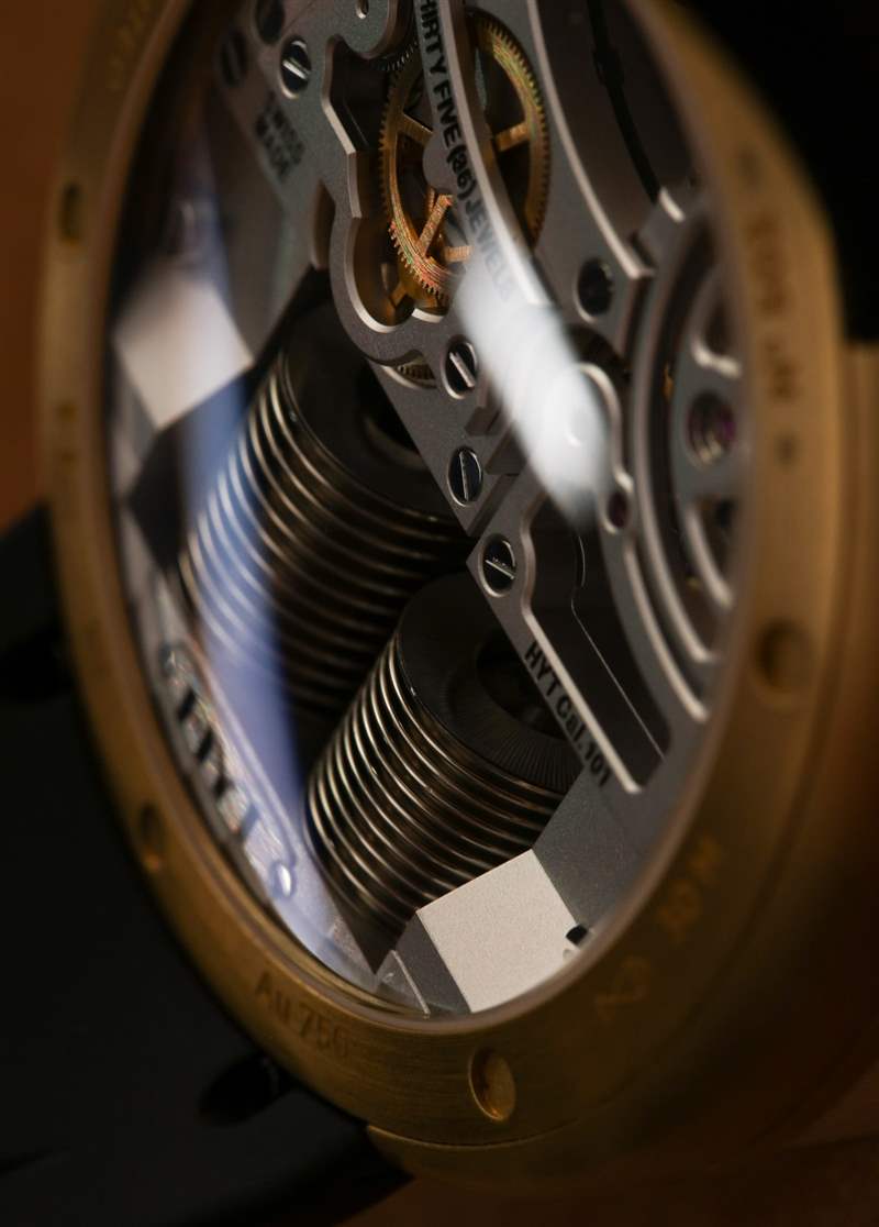在“液壓機械”時標(biāo)指示器中與淺金色配對的是黑色液體(或在另一個 2N 金型號中為紅色)。藍寶石水晶“毛細(xì)管”管后面是一個發(fā)光條,它在黑暗中發(fā)光,有助于在光線不足的情況下閱讀手表。HYT 的 101 型手動上鏈機芯為 H0 提供動力,就像它為 H1 提供動力一樣。HYT 為機芯中的螺絲帽著色,當(dāng)機芯表面在光線的作用下反射出紫色陰影——這是我以前在 H0 手表中從未見過的。機芯以 4 赫茲運行,動力儲存 65 小時,分針和秒針顯示在單獨的表盤上,動力儲存指示器位于輔助秒針盤對面。廣告訊息廣告信息結(jié)束