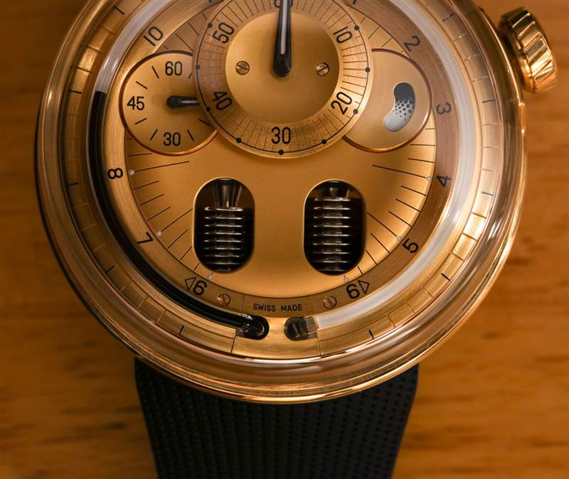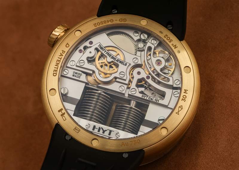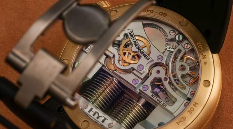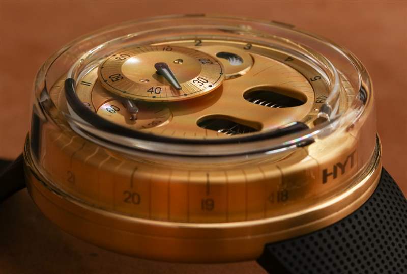 在使液體計時系統(tǒng)正常運行時,緩慢是您的朋友。HYT 101 機芯手表的每個人最喜歡的部分是當(dāng)液體小時指示器觸及管子末端時看到表盤。這會導(dǎo)致波紋管復(fù)位并且相反的液體將指示點一直移動回起點。這可能是你一天只有兩次的最有趣的幾秒鐘。