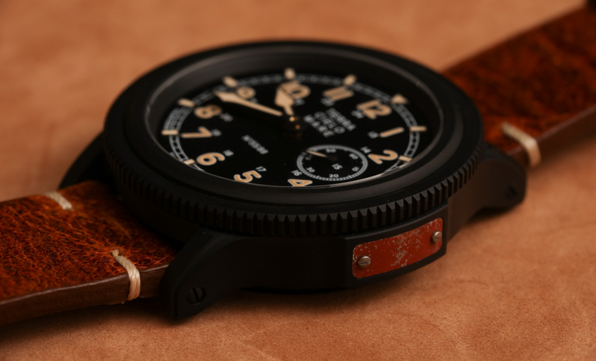 機箱右側是一塊金屬牌匾,上面涂有腐爛的紅色油漆。這就是名稱中“零森”部分的來源。這塊金屬取自二戰日本三菱 A6M 戰斗機——顯然是日本人在太平洋戰區遺棄的那架. A6M 也被稱為“零”,仍然是那個時代最知名的日本汽車。我相信這塊特殊的金屬是從飛機上畫的一個紅色圓圈中切割下來的,它旨在喚起日本國旗并指定飛行該飛機的國家。作為軍事史迷,我發現這種與二戰的聯系很有趣,盡管我確實覺得將手表與武器聯系起來有時是一件令人毛骨悚然的事情。無論如何,即使牌匾很酷,