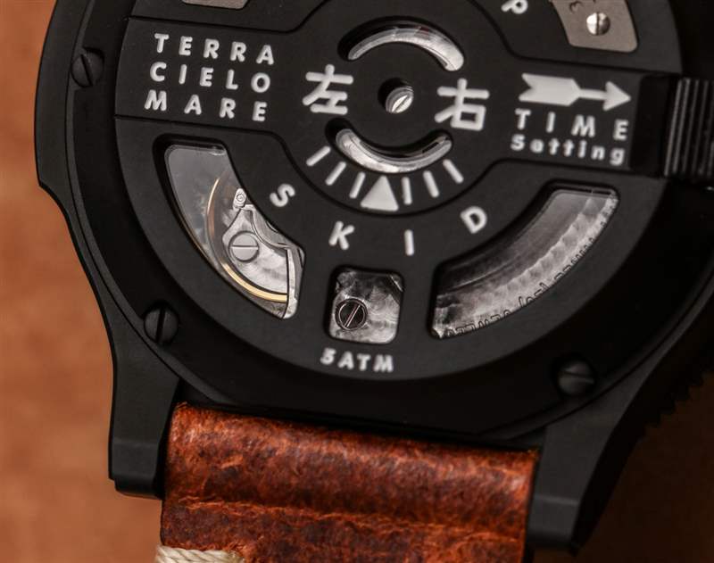 表殼后部有一個半開放式金屬表背蓋在藍寶石水晶上,Terra Cielo Mare 稱之為“兩層背殼”。其設計有一個防滑測斜儀的演繹,帶有日語字符“左”和“右”。表殼本身防水深度達 50 米,采用鈦金屬制成,并帶有啞光黑色 PVD ??涂層。戴在手腕上非常舒適,表殼寬 43 毫米(不包括表冠系統),厚約 15 毫米。我發現它是介于“可穿戴”和“運動”之間的一個非常合適的尺寸。廣告訊息廣告信息結束